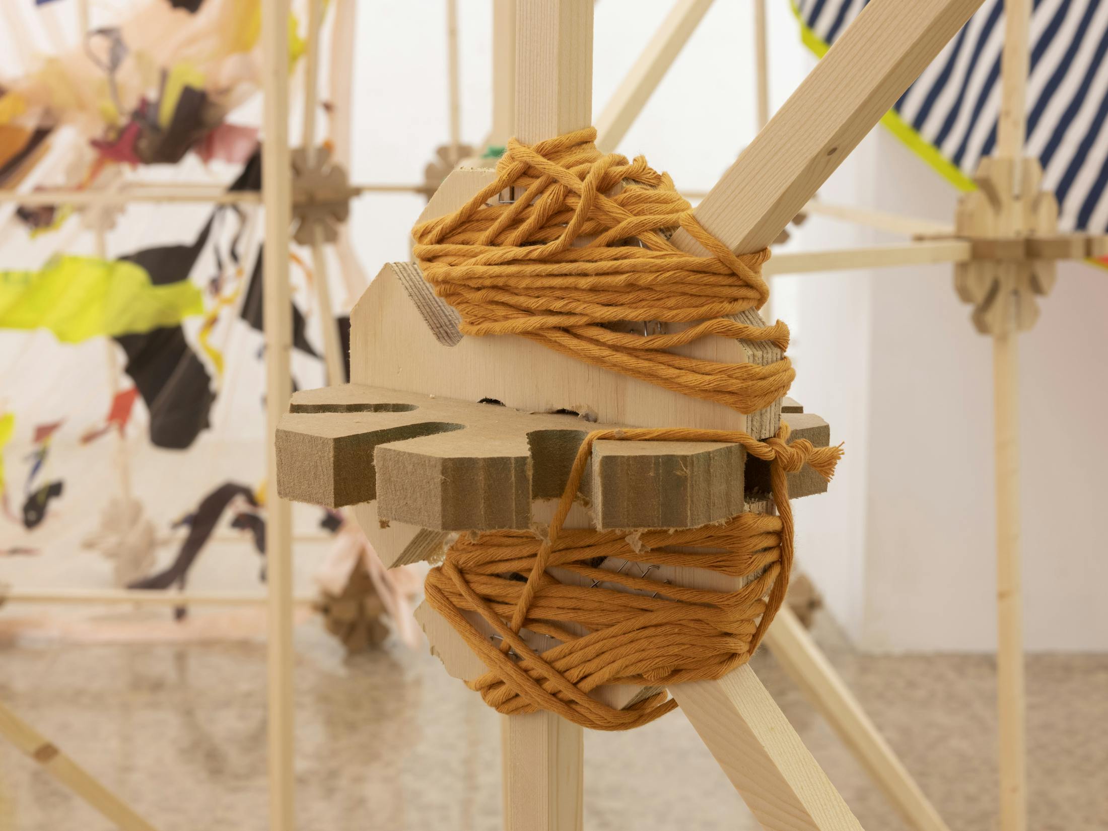 Desde que Ariadna Guiteras es madre el algoritmo de IG le enseña juegos de construcción de cabañas para niñes. Inspirada en estos juegos, Dos garras que hacen un huevo parte de una estructura modular que se convierte, a veces en refugio, a veces en trampa.